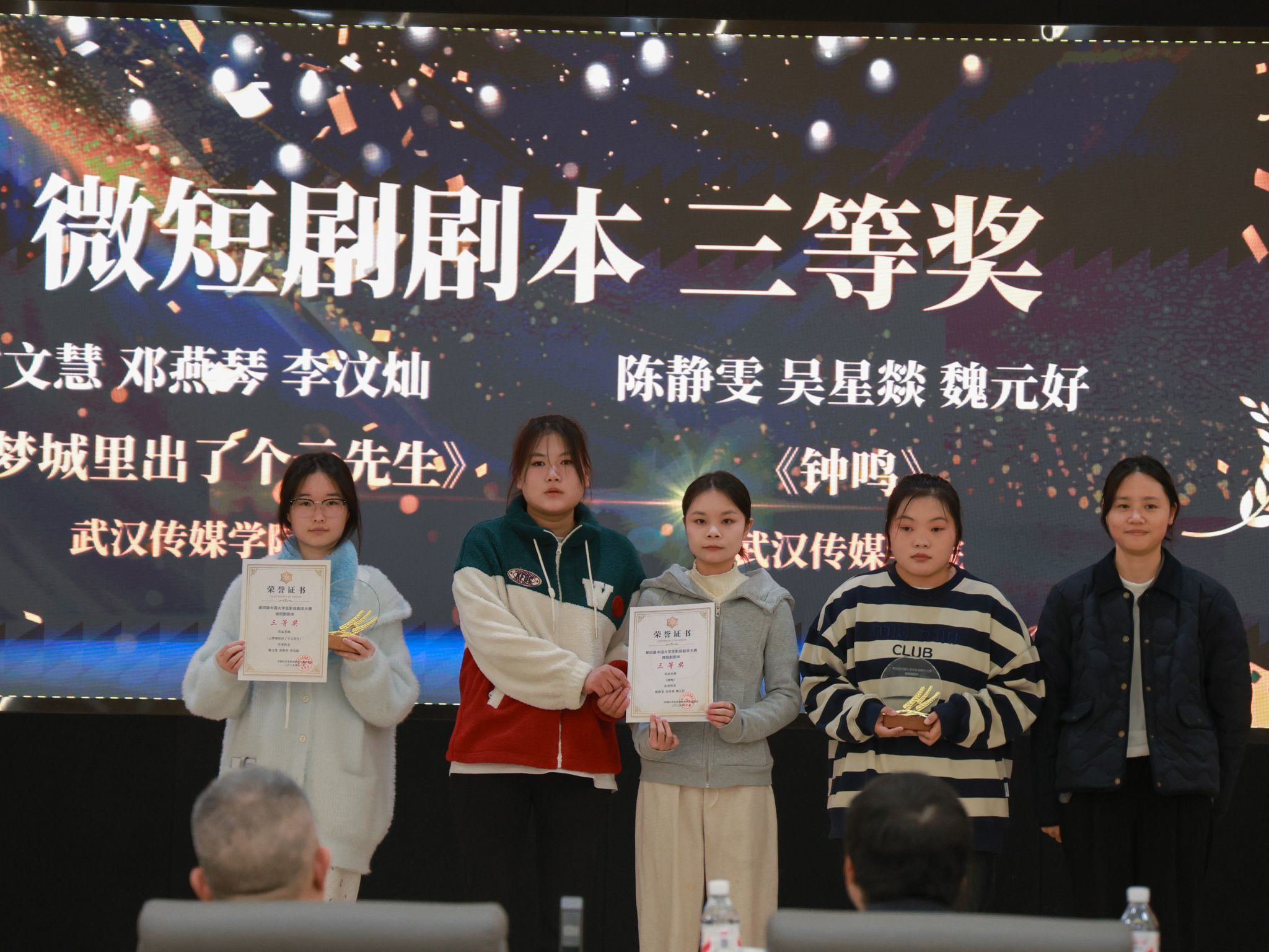 本届大赛微短剧剧本赛道与湖北省“视听长江”微短剧剧本大赛深度联动。该赛道颁奖环节中,武汉骏乐影视文化传播有限公司内容中心主编程梦婷女士为优秀奖获得者颁奖,武汉传媒学院王国智《渡河》斩获殊荣;湖北长江电影集团影视创作中心副主任徐蓓女士颁发三等奖,武汉传媒学院谢文慧团队作品《云梦城里出了个云先生》与陈静雯团队作品《钟鸣》双作齐辉、共同获奖;湖北省广电局网络视听节目管理处副处长孔祥斌先生为二等奖颁奖,北京中医药大学宋钕帆携《蕲艾沉香令》摘得奖项。