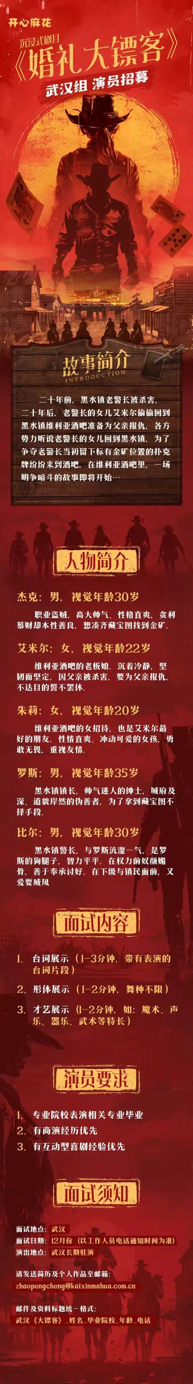 开心麻花沉浸式剧目《婚礼大镖客》武汉组演员招募