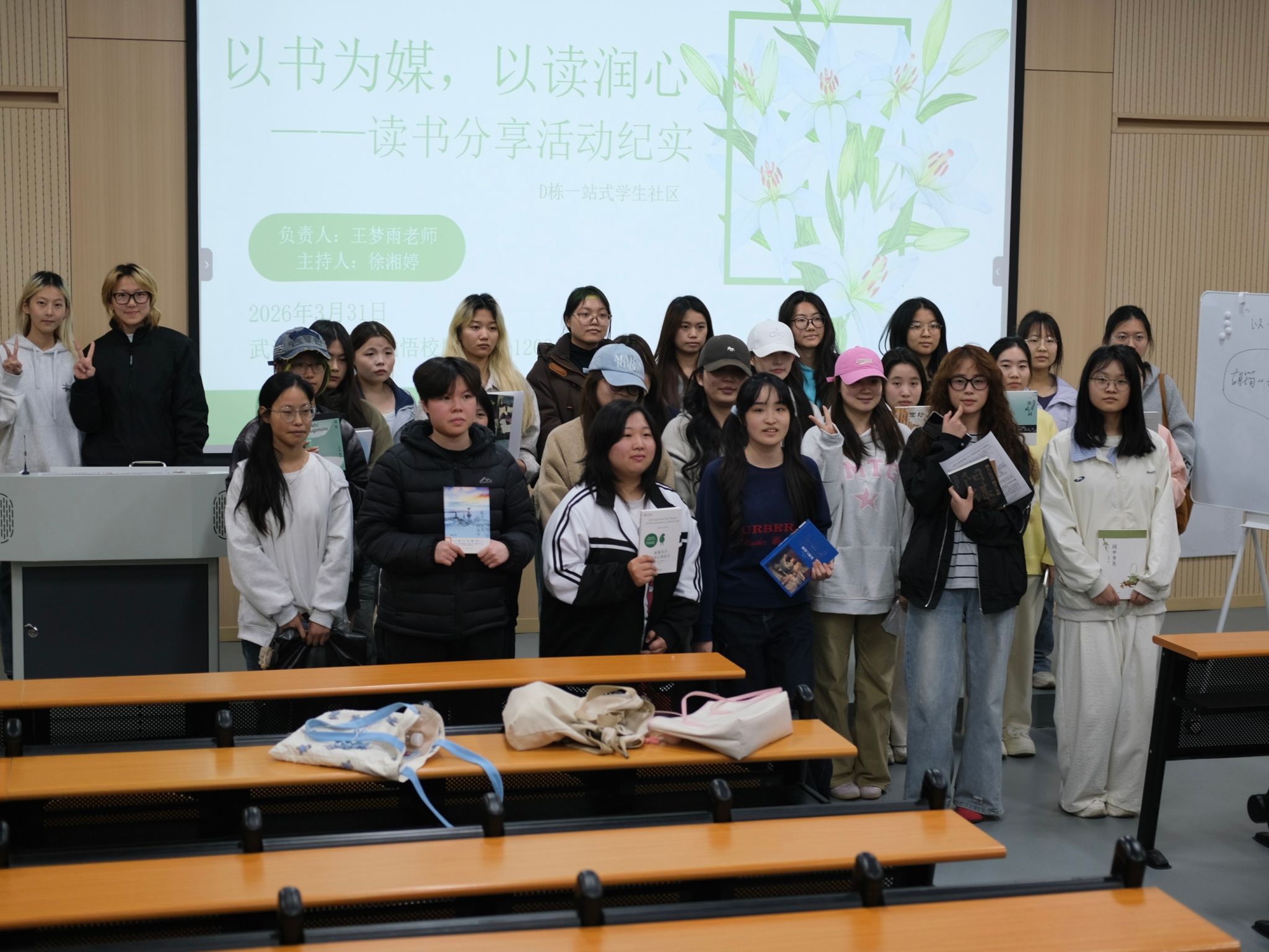 新闻与媒体中心网讯(文/见习记者 张澜 图/摄影记者 肖诗绚 编辑/陈睿涵 责编/李马莹)2026年3月31日18点,由武汉传媒学院(大悟校区)D栋“一站式”学生社区承办的“书香润心,阅享成长”读书分享会于1号教学楼1202教室举行。
