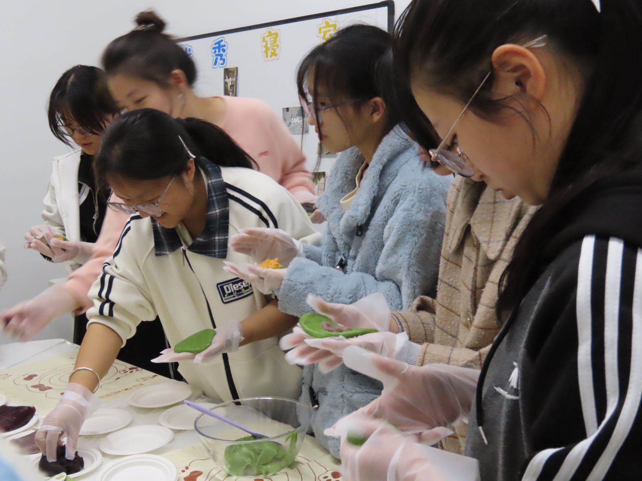活动现场艾草清香四溢,同学们围坐桌前,按流程有序开展青团制作。大家分工协作,专注完成面团揉制、包裹豆沙与肉松馅料等工序,青团相继成型,现场秩序井然,制作氛围浓厚。