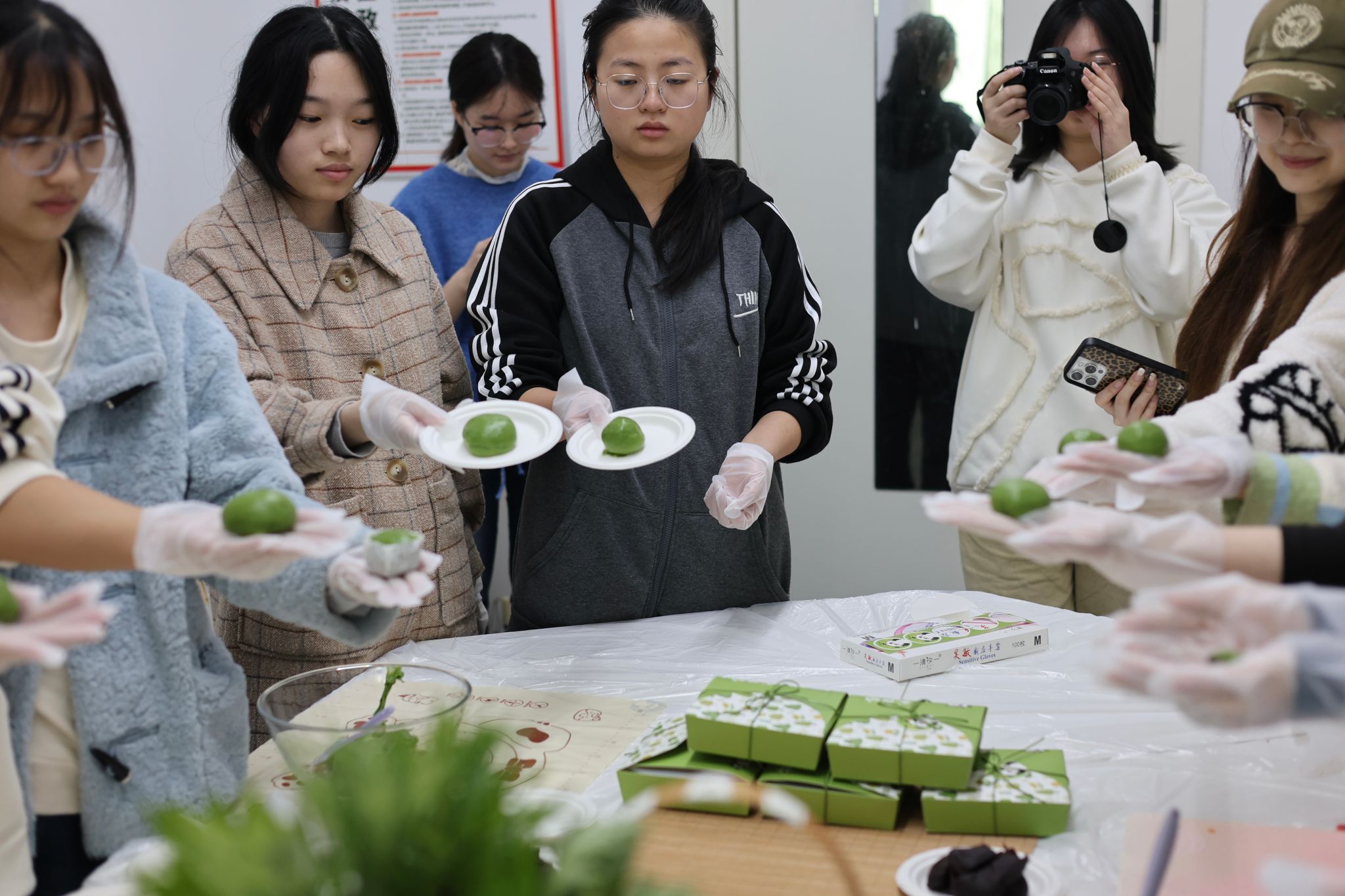 随后进入同学们亲手制作青团的体验环节。从青团皮的揉制、馅料的配比,到收口捏合的手法技巧,老师将传统手艺的要点逐一拆解演示,讲解清晰易懂。烹饪社骨干成员分组开展教学,手把手指导包馅要领,耐心帮助同学们解决制作过程中遇到的问题,让大家都能轻松上手体验制作乐趣。