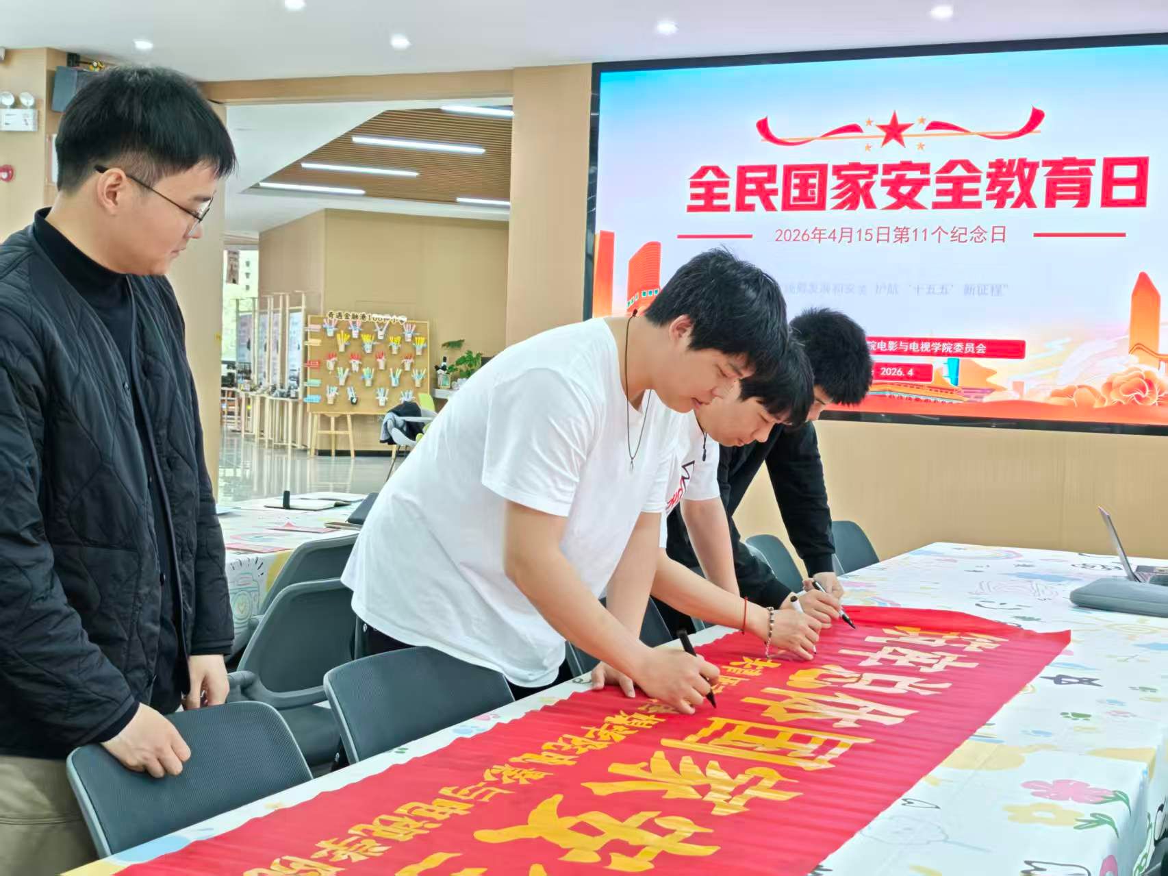 活动伊始,电影与电视学院团委副书记(学生)刘杭围绕总体国家安全观的核心内涵、时代价值与实践要求进行宣讲。宣讲结合典型案例,系统讲解政治安全、经济安全、社会安全、网络安全等重点领域安全知识,引导商户代表、居民认清国家安全与日常生活的紧密联系,增强防范意识与法治观念,自觉做国家安全的遵守者、维护者。宣讲结束后,全体与会人员在“践行总体国家安全观,筑牢人民防线”主题横幅上郑重签名,以实际行动表达维护国家安全的坚定决心。