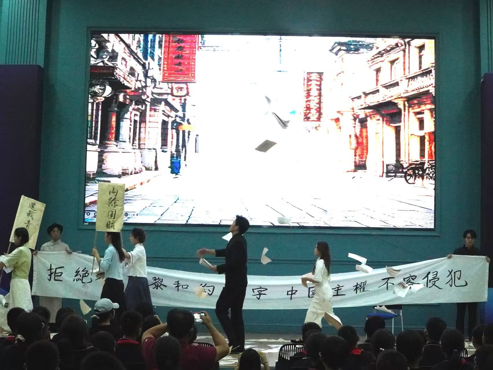 活动高潮是沉浸式思政戏剧《忆·1919》片段展演。我院戏剧教育系十七位同学再现了1919年爱国青年为民族觉醒奔走的历史场景,深刻传递出“五四精神”的核心内涵。演员们情感真挚、表现力强,引发在场师生对历史的深度思考和强烈共鸣。演出结束后,全场响起经久不息的掌声。