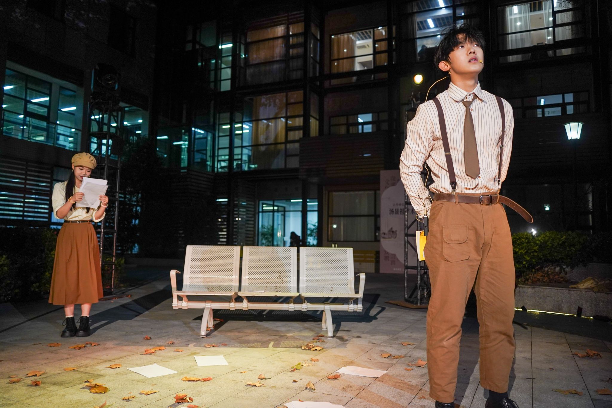 《三点二十》由戏剧教育系文滔老师编剧、导演,戏教B2401班同学共创,其中闫澜沣任副导演,王贺负责舞台监督,房信瀚、赖彦琪领衔主演。作品以“车站候车”为核心场景,通过20分钟内陌生男女的对话互动,用环环相扣的情节解构“灵魂伴侣”的理想情感形态;舞台设计极简,仅以一把长椅、一册书稿作为道具,让观众聚焦于演员表演。两位主演以极具张力的肢体语言与富有感染力的台词,细腻呈现角色从“西蒙・波伏娃式精神共鸣”憧憬到幻想破灭的心理转变。既戳中当代人“诗与远方”的轻率向往,又抛出“相爱还是自恋”的深刻追问,引发观众对情感本质的思考。