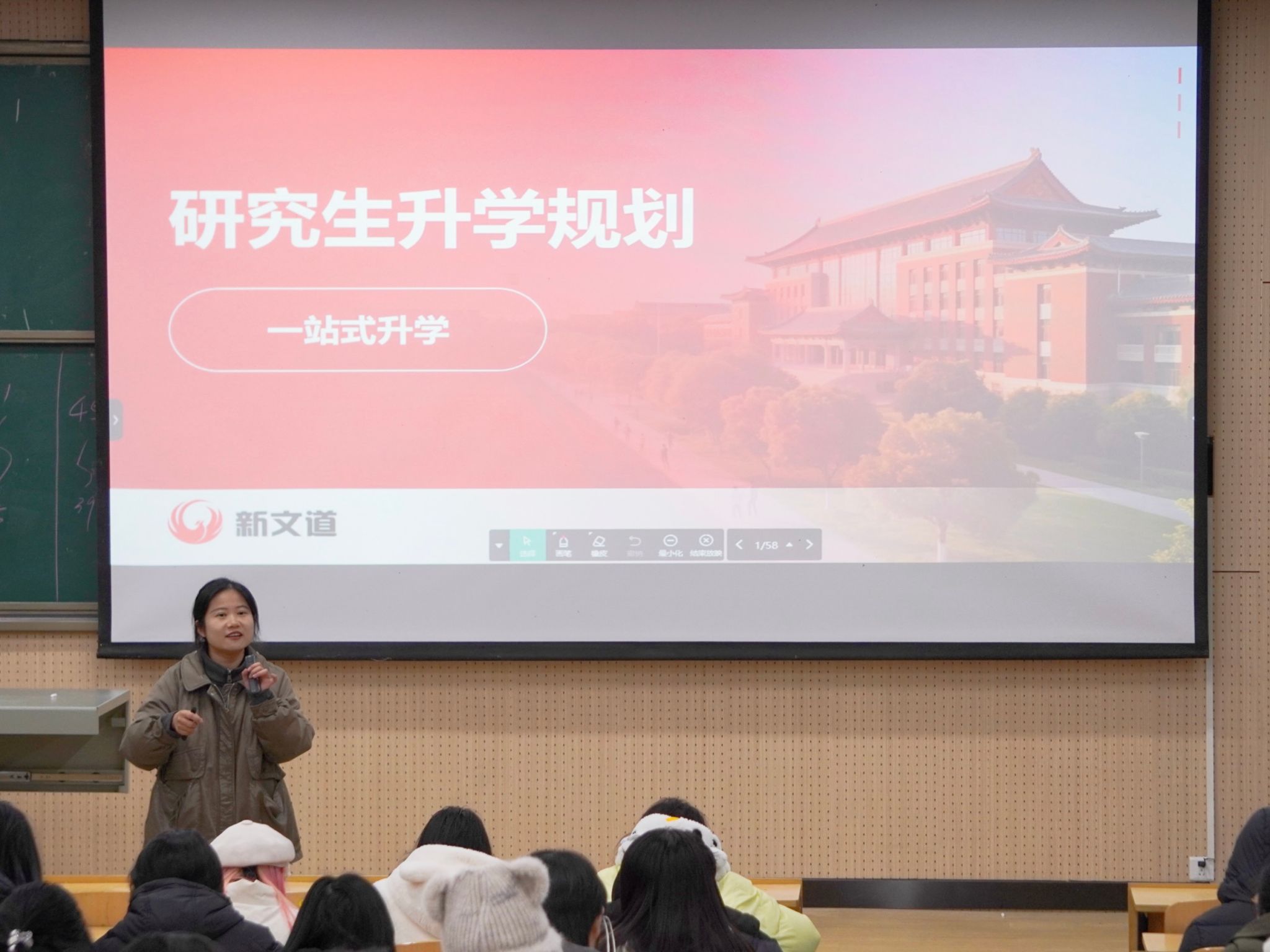 新闻与媒体中心网讯(文/记者 甘佳瑜 图/摄影记者 丁伊娜 编辑/张呈瑞 责编/李一)2026年1月3日晚8点,武汉传媒学院电影与电视学院于我校(武汉校区)7号教学楼7108教室顺利举办了研究生升学规划分享会。本次活动特邀新文道孙佩老师担任主讲人,我院2023级(大三)全体本科生与该年级辅导员范钰晨、肖斯琴、曲光浩三位老师共同到场参与。此次专业分享旨在帮助大三学子明确学历提升路径,缓解升学焦虑,助力同学们在职业发展道路上做出合适选择。