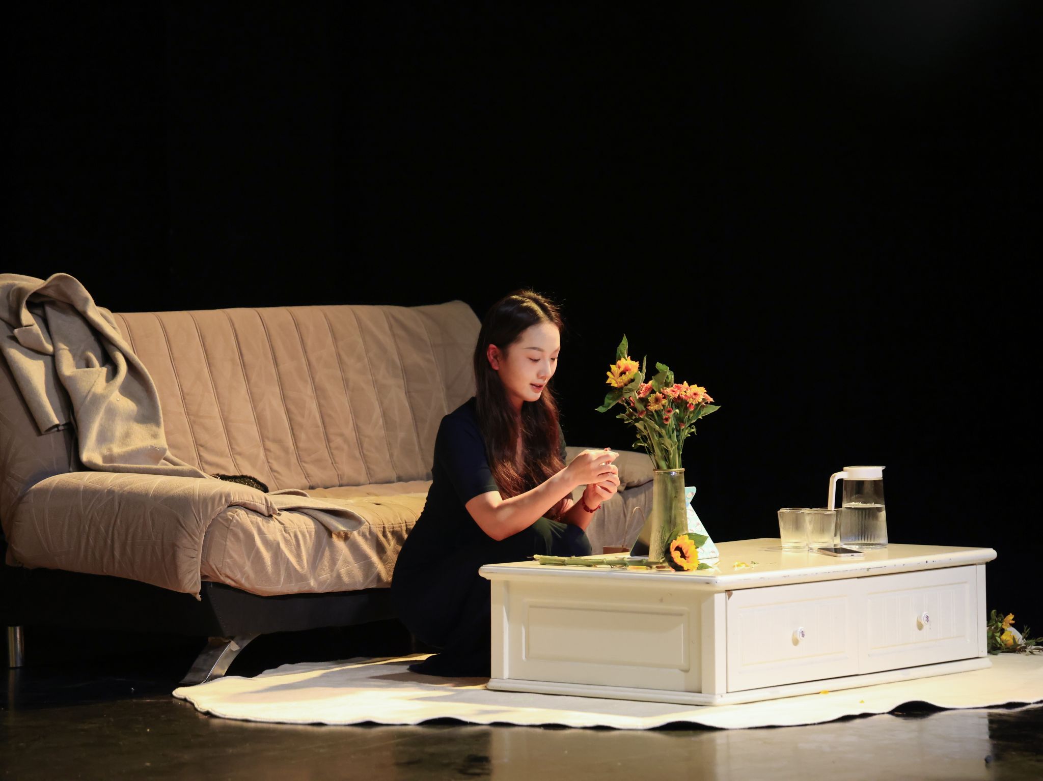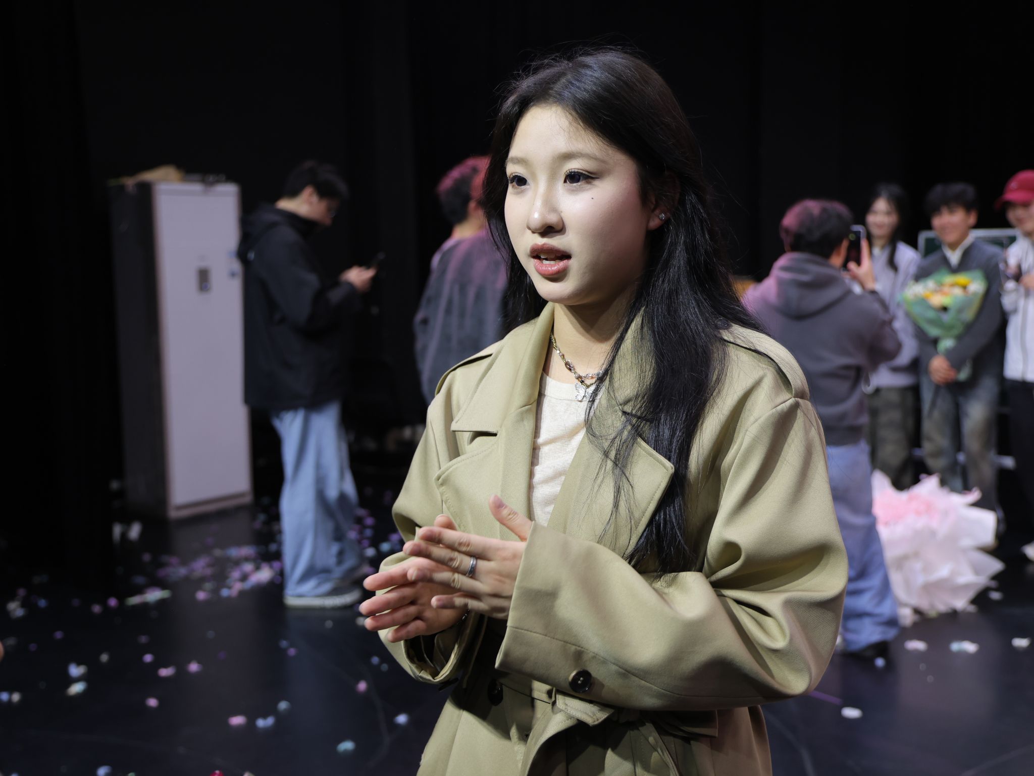 演出结束后,刘子纯老师分享了创作理念。她提到,演出中虽有手机意外被打落的小插曲,但演员迅速将其转化为自然反应,未影响整体节奏。谈及剧目内核,刘子纯表示:“这部剧主要想反映的是珍惜当下——生活中虽有诸多不如意或意外,但把握住身边的人最为重要。”她同时肯定了学生们的勇气与努力,认为他们在毕业创作阶段选择高难度形式,克服了诸多问题,使得剧目最终顺利展演。