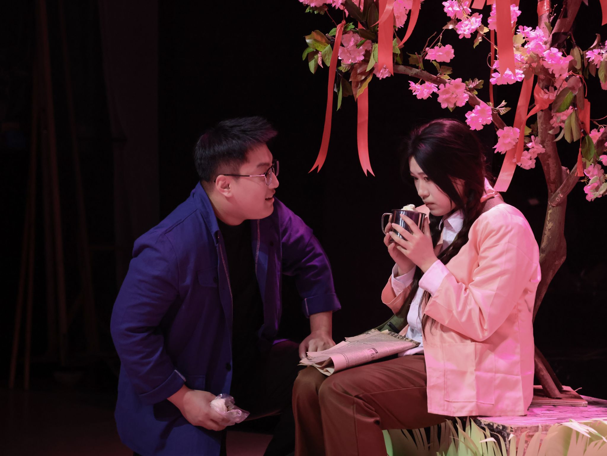 《同心锁》、《向日葵》、《渡冥灯》三部剧目由康宗祁老师担任指导。其中,剧目《同心锁》为康宗祁老师、马莉老师共同执导。该剧目用三十年串联起两个时空,以一把象征爱情承诺的“同心锁”为线索,将两段相隔三十年的爱情并置于同一舞台空间,在当下都市情感的迷茫与过去知青时代的漫长坚守之间,展开了一场关于“爱是什么”的安静对话。