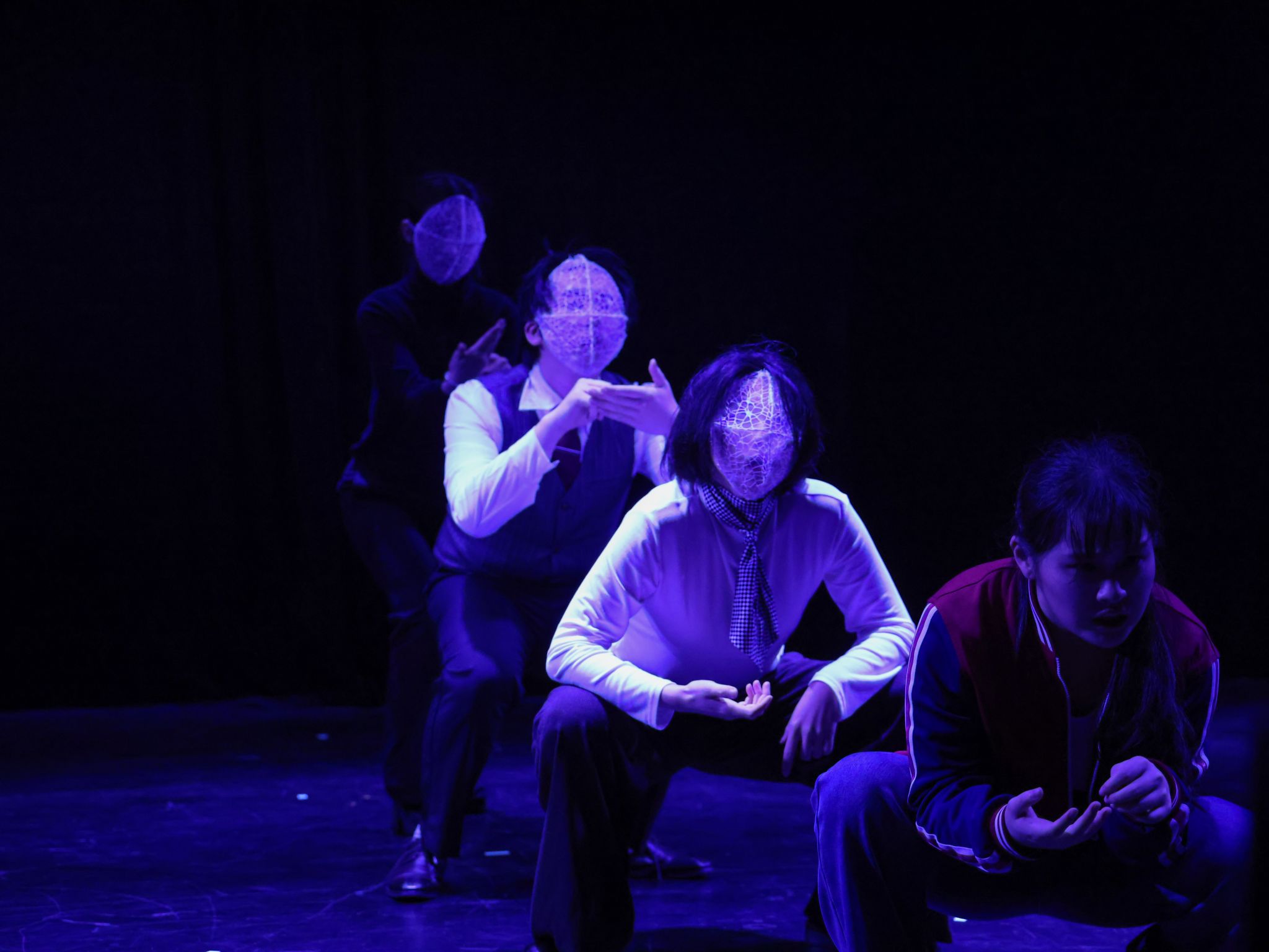 针对舞台道具“面罩”的象征意义,周洲老师表示:“使用面罩的初衷,是将剧中主要角色与其他角色分离开。用钢丝搭出骨架,除了使道具更稳固外,也代表着‘规训’与‘教条’对人硬性的、框架式的束缚。而白纱和蜘蛛网的布料,则隐喻人在回忆过往时,很难清晰地回忆起某个人的具体模样,只剩下朦胧的印象和对那段经历的感受。”